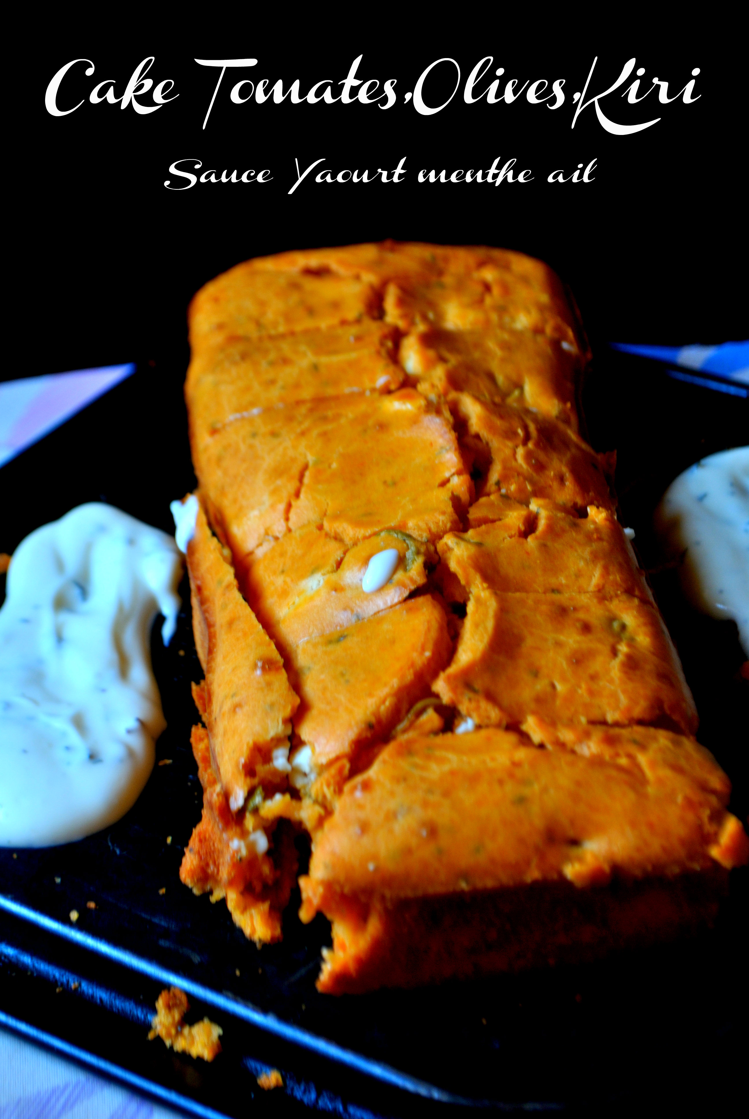 Cake à la Tomate/Olives/Kiri et sa Sauce Yaourt/Menthe et Ail et Pickles de Concombre