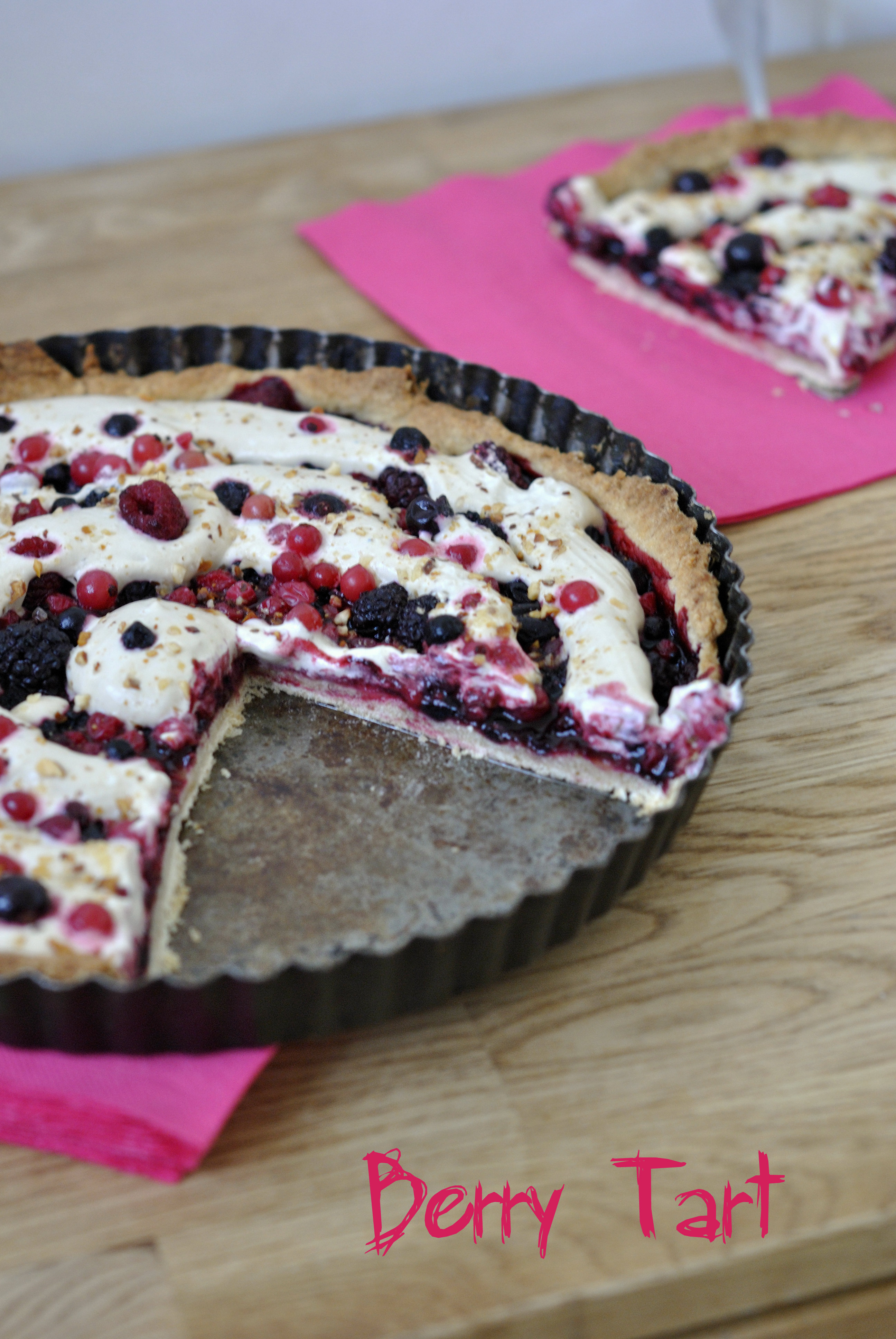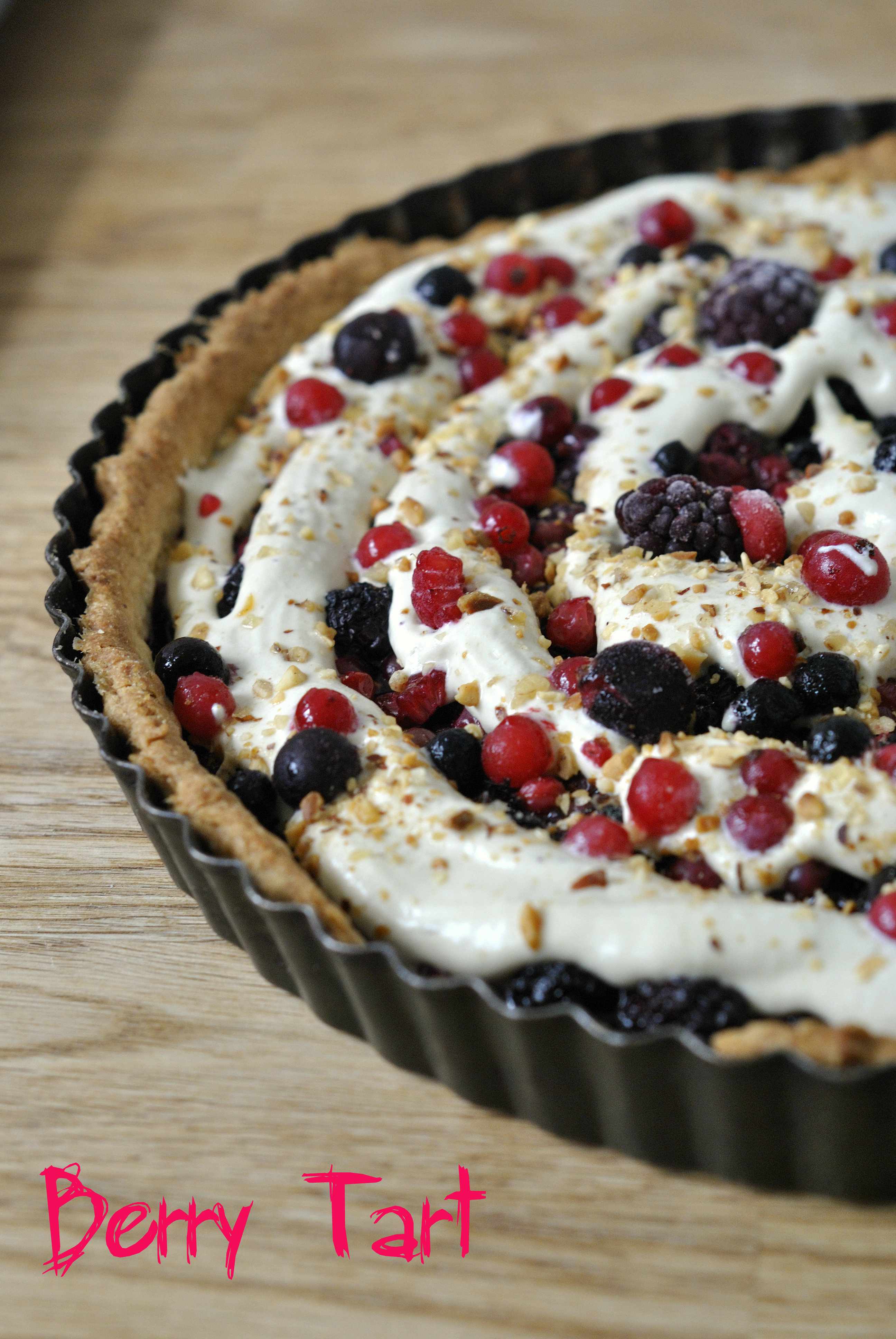 - 20cl de crême liquide + 50gr de sucre vergeoise à monter en chantilly et à disposer sur la tarte refroidie,avec les 50 gr de fruits restants,et du pralin
