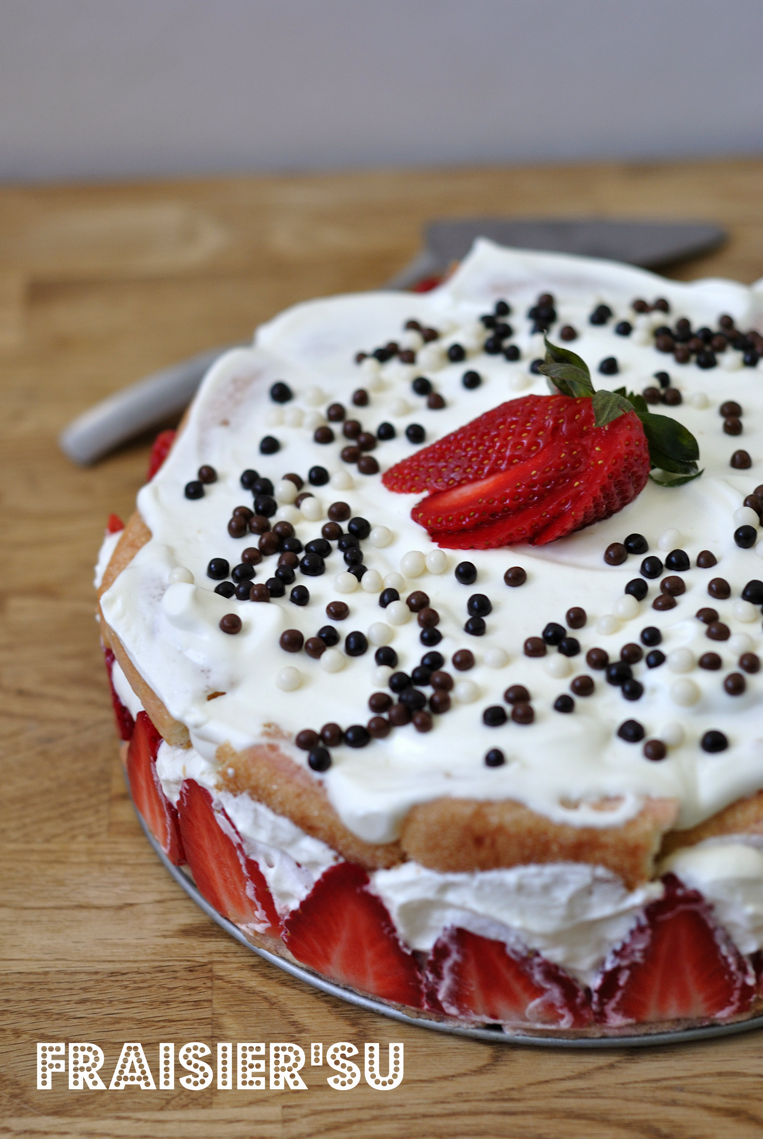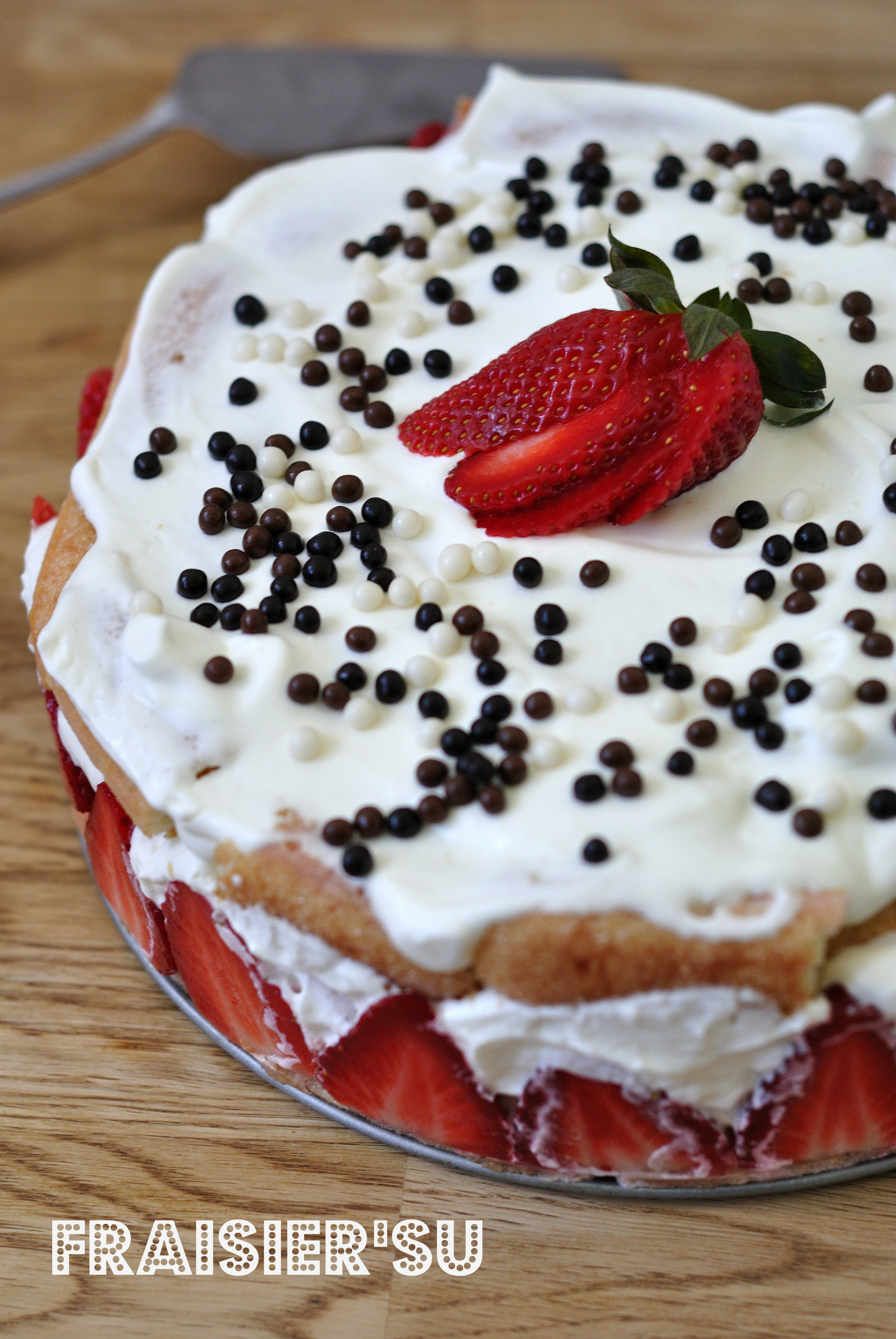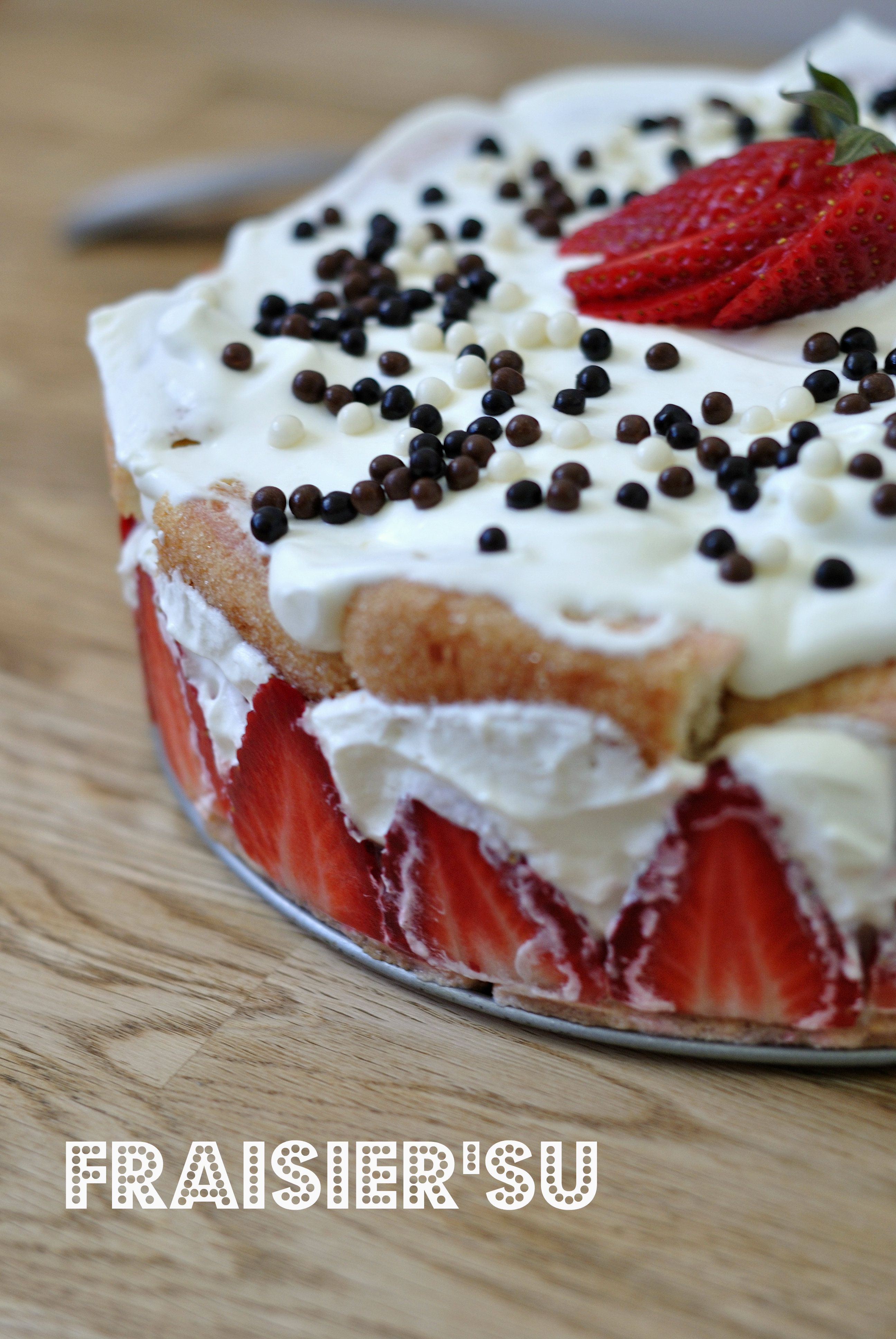 Ah bah vi cette fois ci pour mon achat de fraises je remets la faute sur…(think!!thinkkkk!) : le printemps!Il arrive dans 3 jours dixit le calendrier Grégorien,et moi le printemps ça me dit : asperges,fraises,petits oignons blancs,enfin bons,z’avez compris le topo.Alors hein c’est pas pour quelques jours qu’on va me flageller à coup de spaghettis.Donc fraisier fastoche pourquoi?J’avais envie de tiramisu,mais je ne suis vraiment pas du tout fan de l’oeuf cru dans la préparation.J’avais envie d’un fraisier,mais pas vraiment fan du beurre dans la crême mousseline.Alors j’ai fait un mix. En gros ce sont des fraises chantilly améliorées.Mais qu’est-ce que c’était bon!