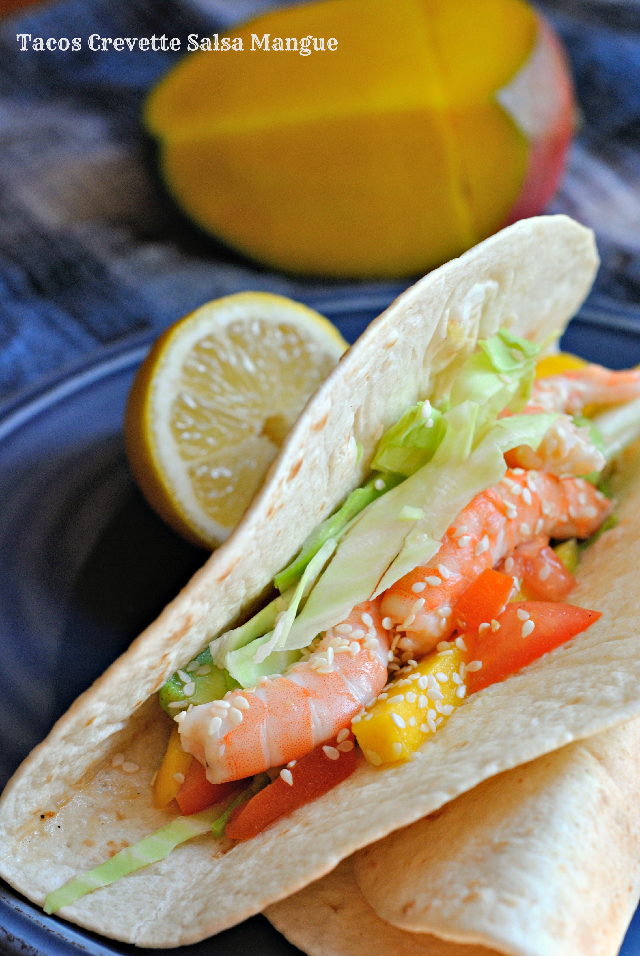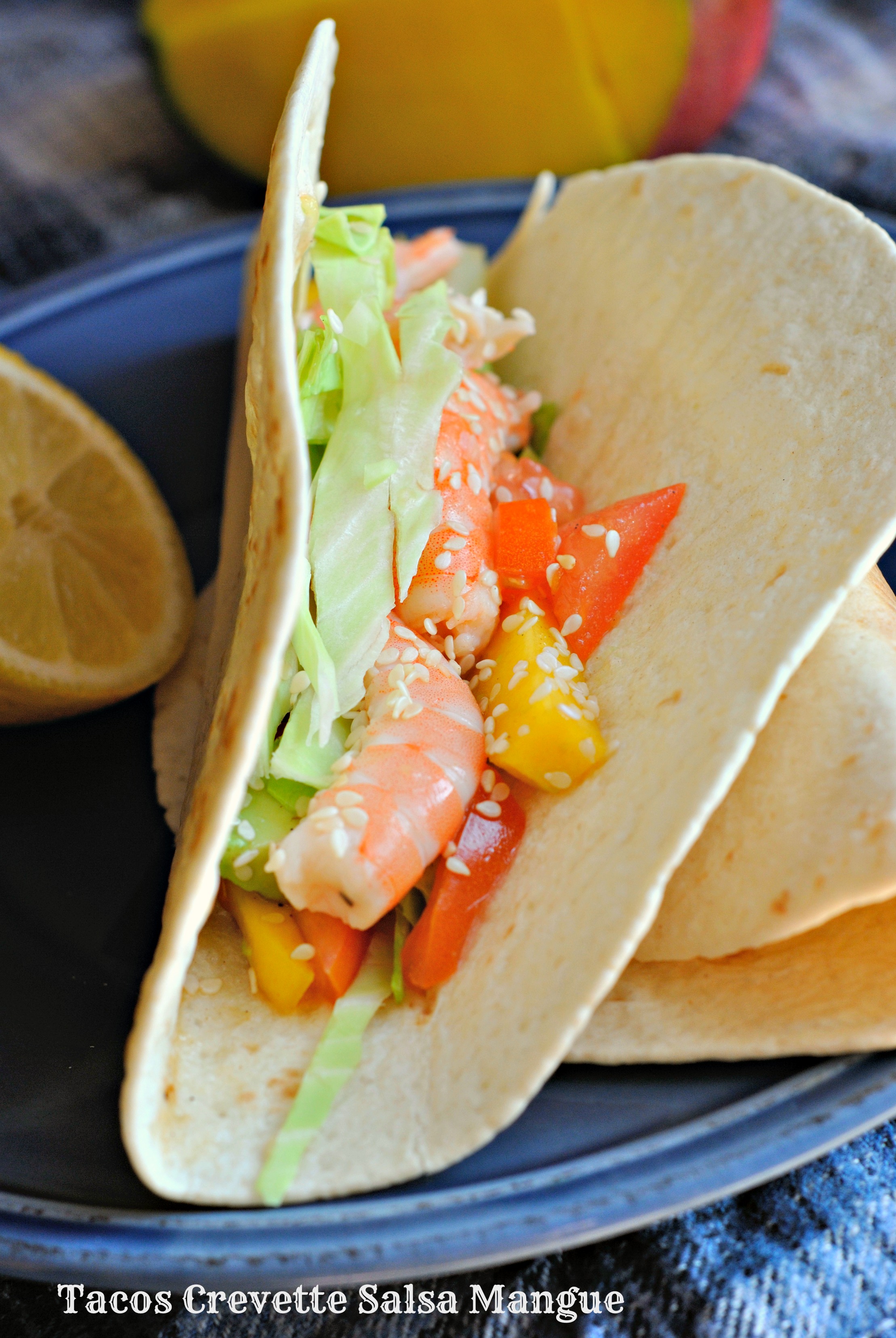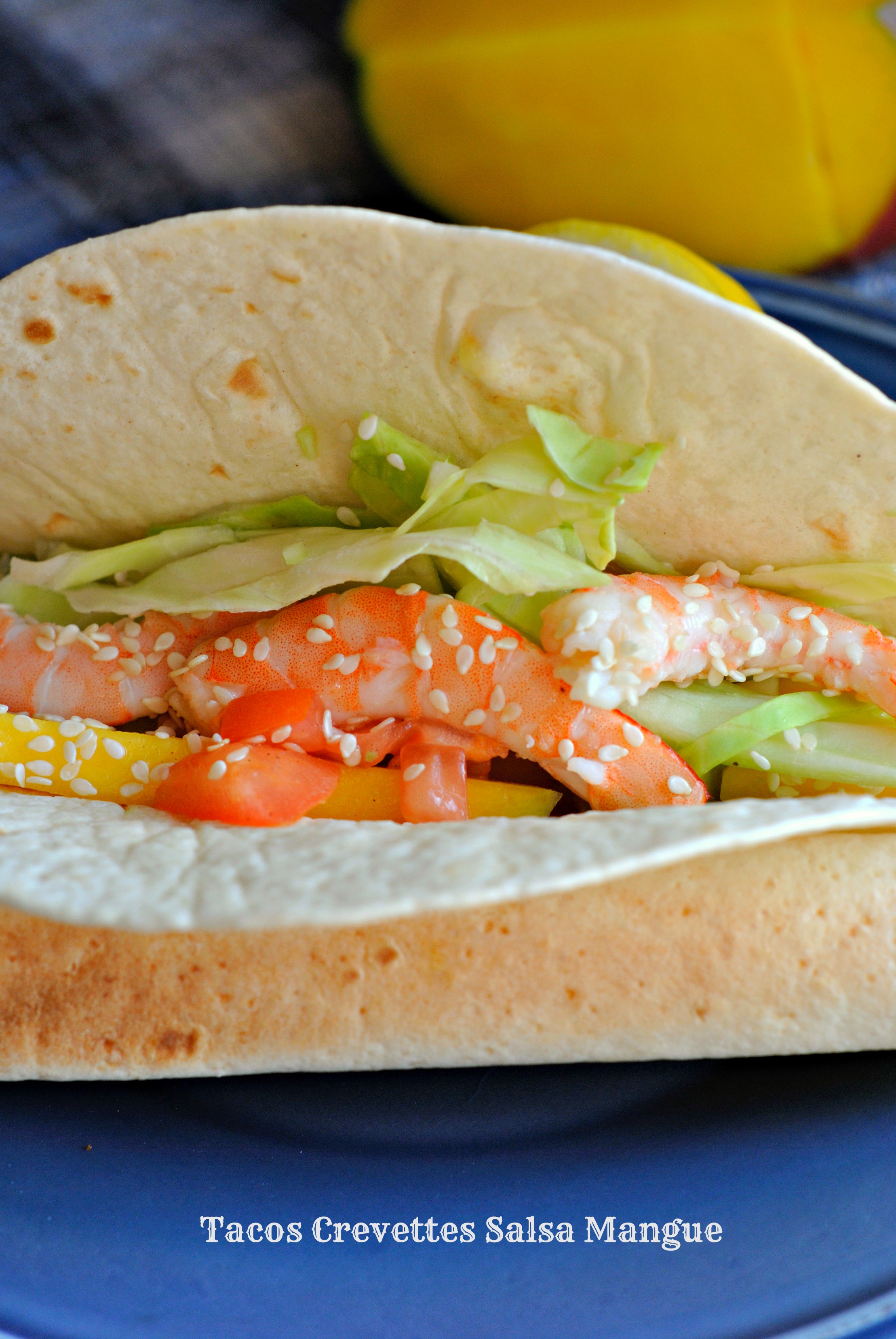 Quand les tortillas sont cuites et ont pris leur forme de tacos,les garnir d’un peu de salsa,de chou,et de crevettes.