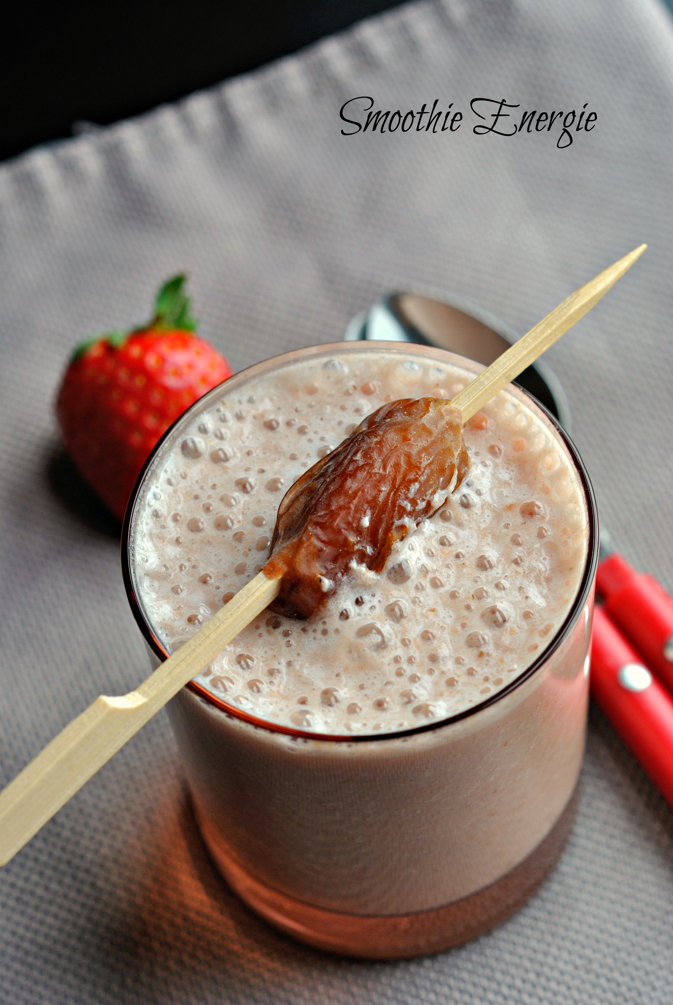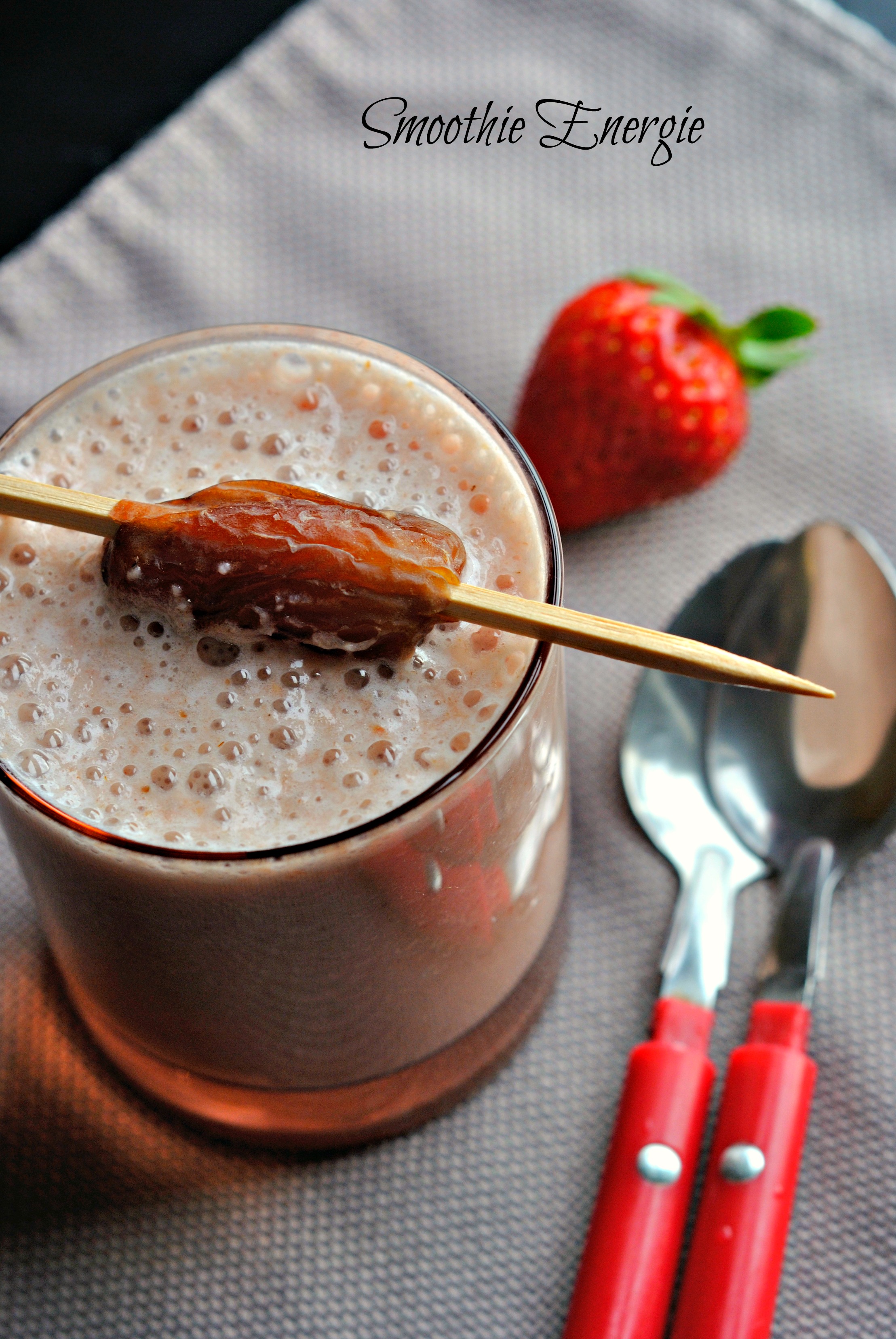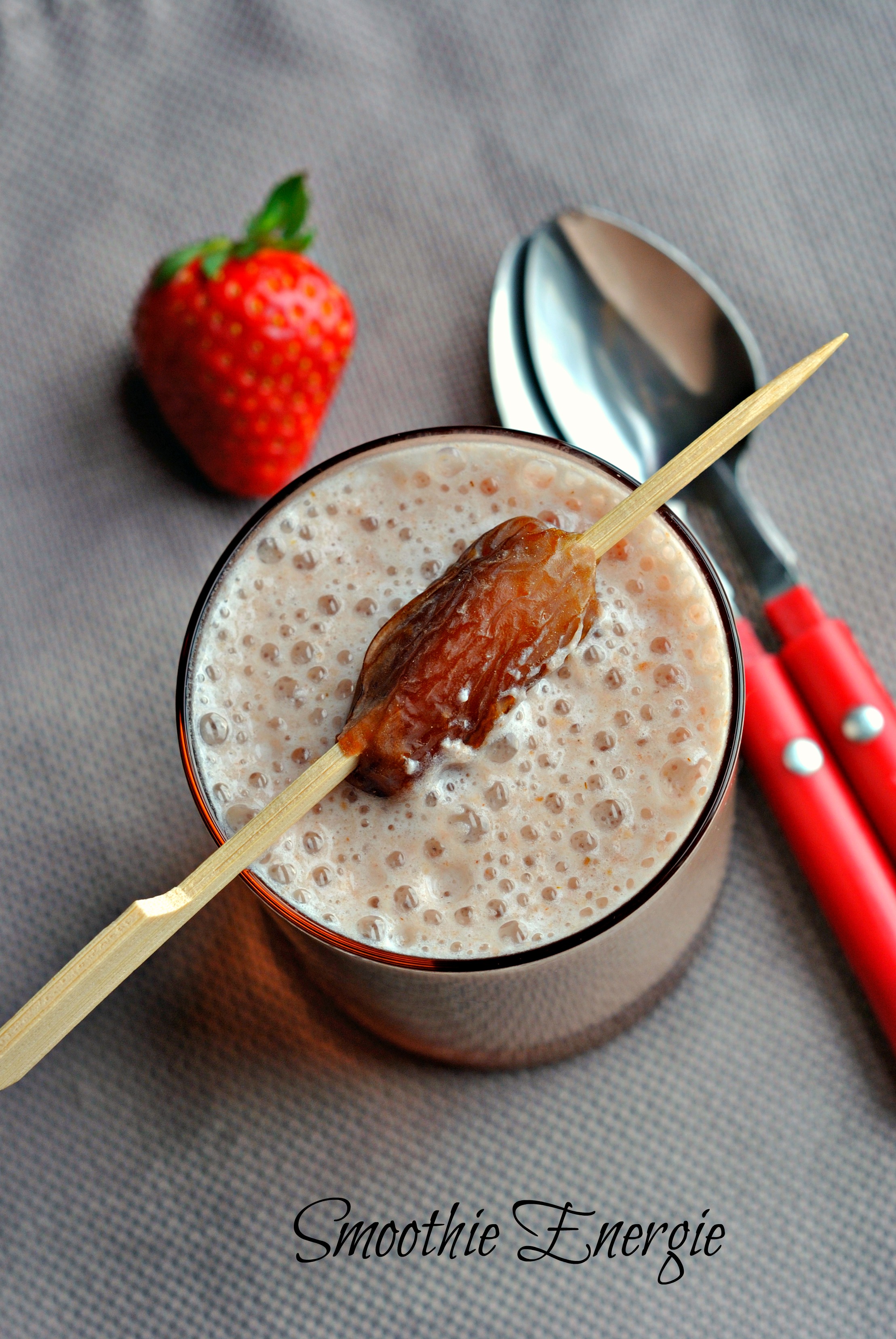 Dénoyauter les dattes (sinon tu pètes ton blender hein),équeuter et rincer les fraises,disposer tous les ingrédients dans le blender,et mixer pendant quelques minutes.