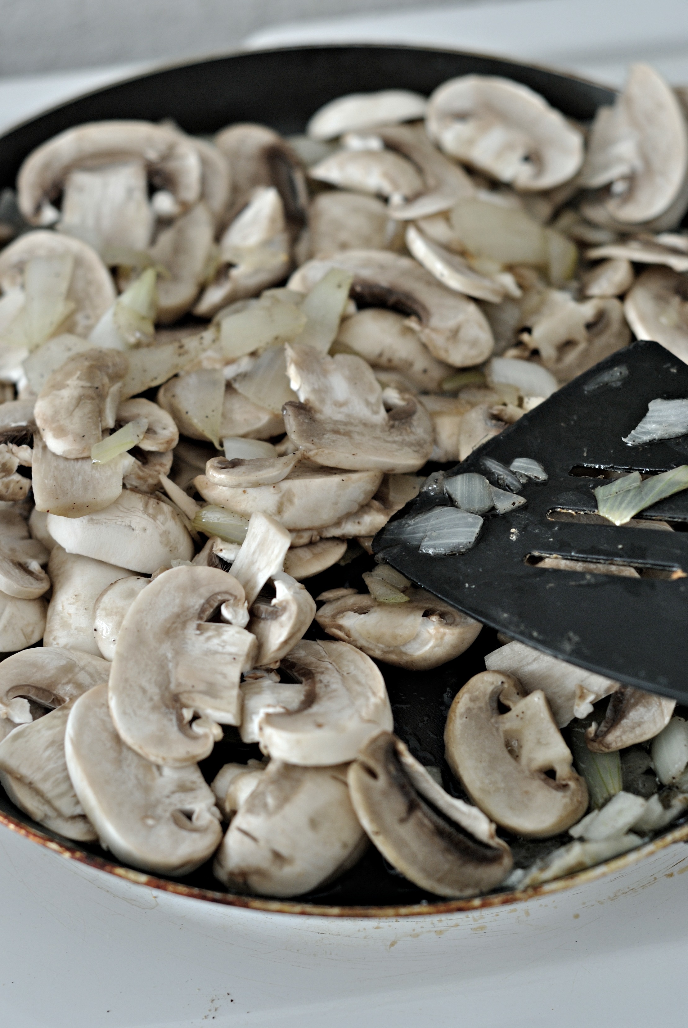 Dans une poêle,avec un fond d’huile d’olive chaude,déposer vos champignons et oignon,et laisser cuire en remuant pendant une dizaine de minutes à feu moyen.Passer ce délai,éteindre le feu,détendre avec la crème épaisse,saler,et poivrer.
