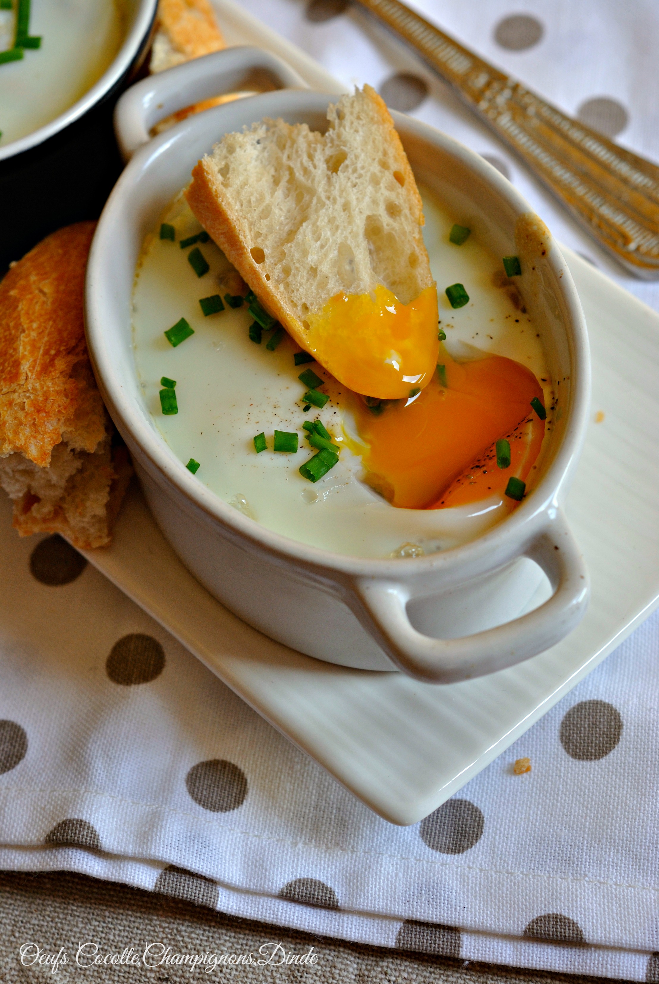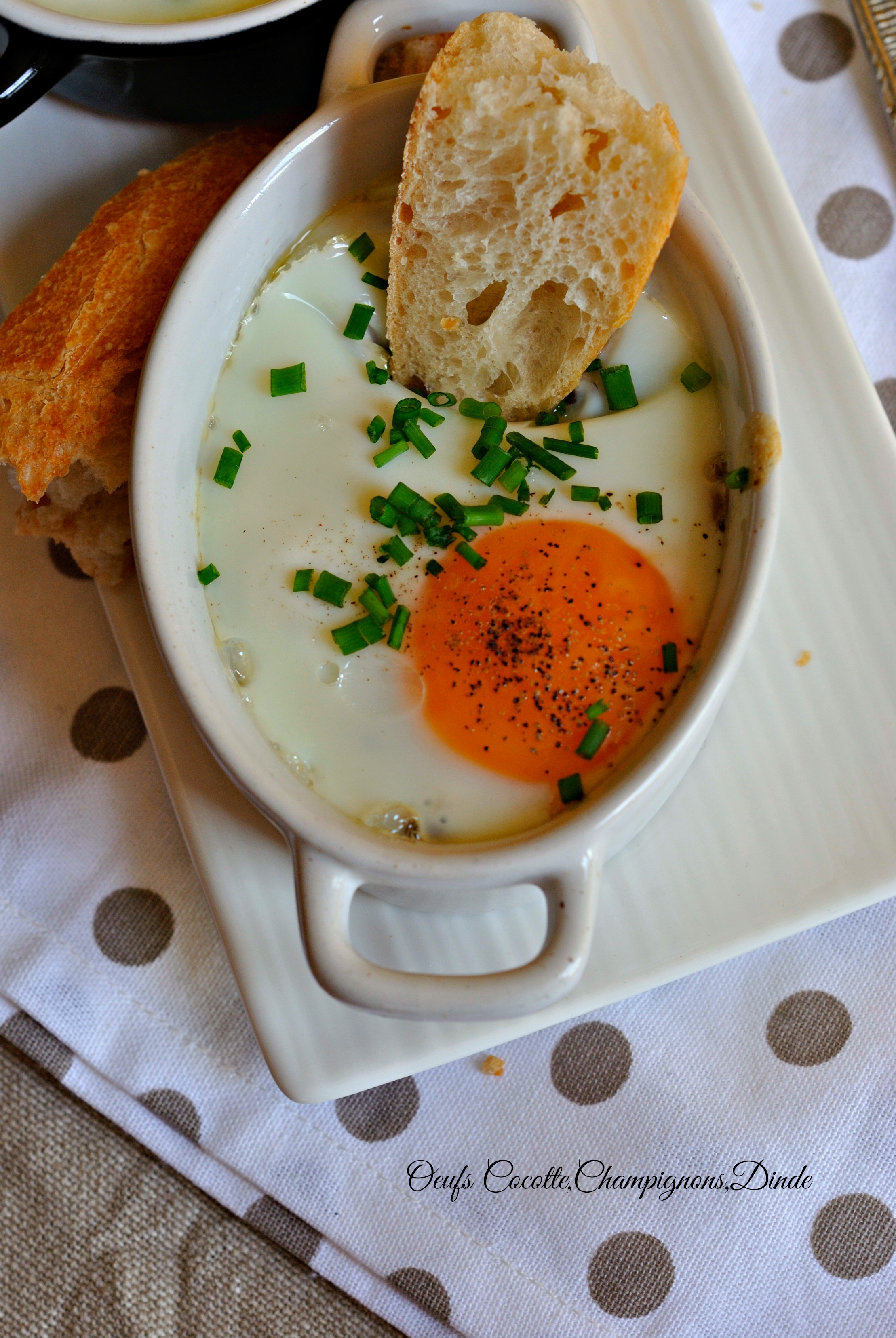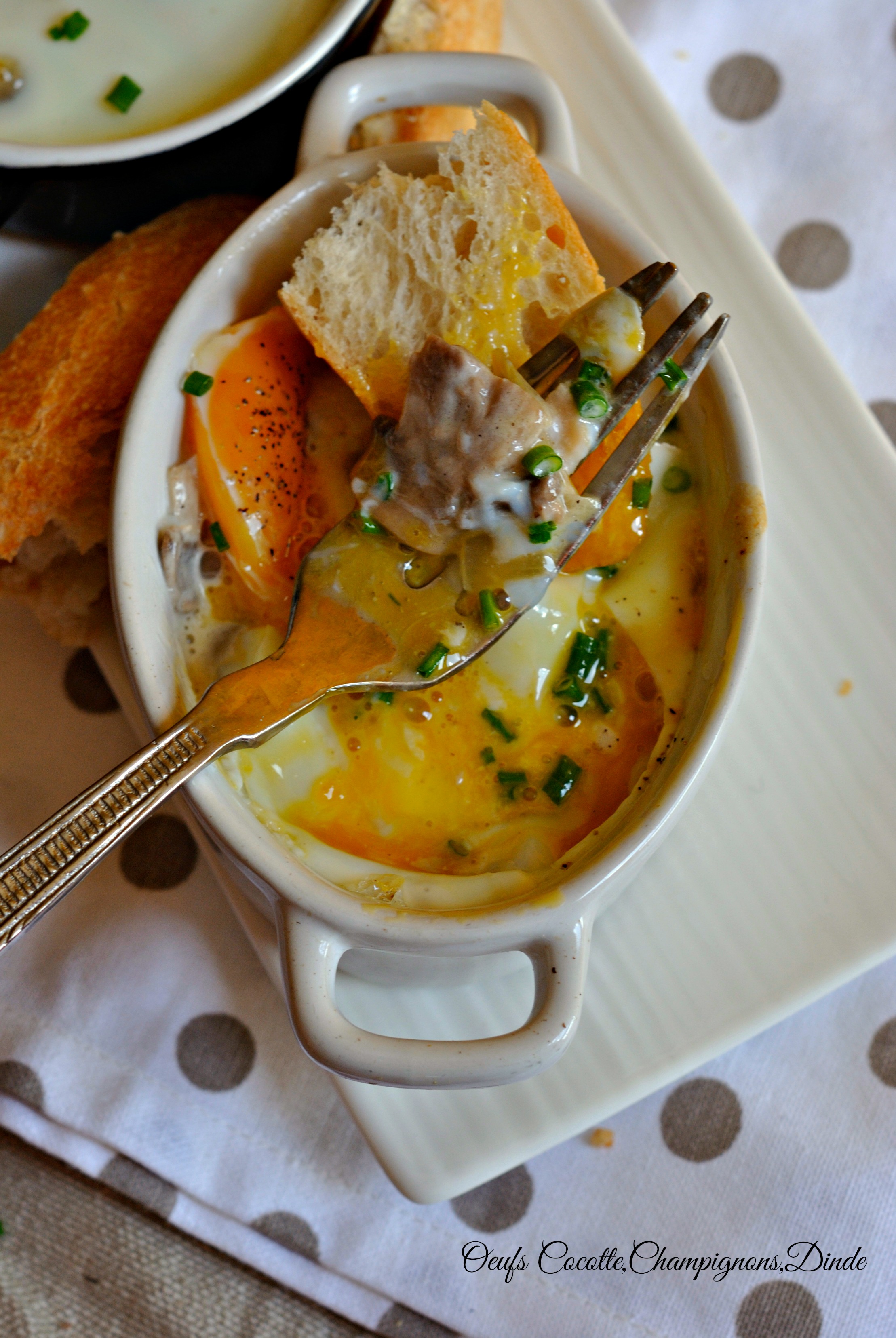 Y déposer les champi à la crème,puis la dinde que vous aurez taillé en petits carrés,puis casser un oeuf par dessus.