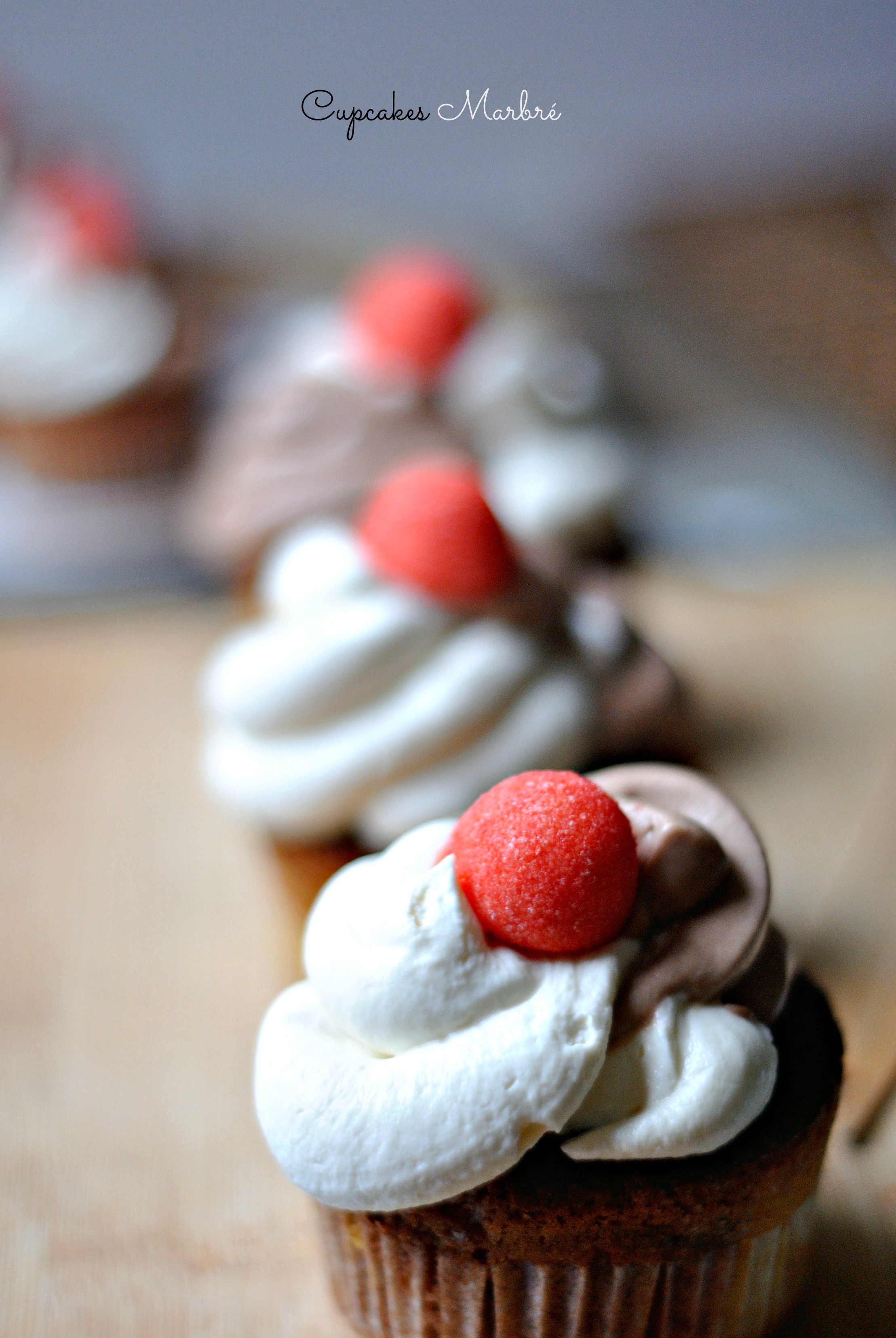 *Prendre une poche à douille (les miennes sont en plastiques jetables),y mettre la chantilly blanche.Faire de même dans une autre poche à douille avec la chantilly marron.Dans une troisième poche à douille vide,y insérer les deux poches à douille remplies.Puis couper le bout à l’aide d’un ciseau et décorer vos cupcakes,en tournant sur le dessus.Décorer (ou pas) d’une fraise tagada.