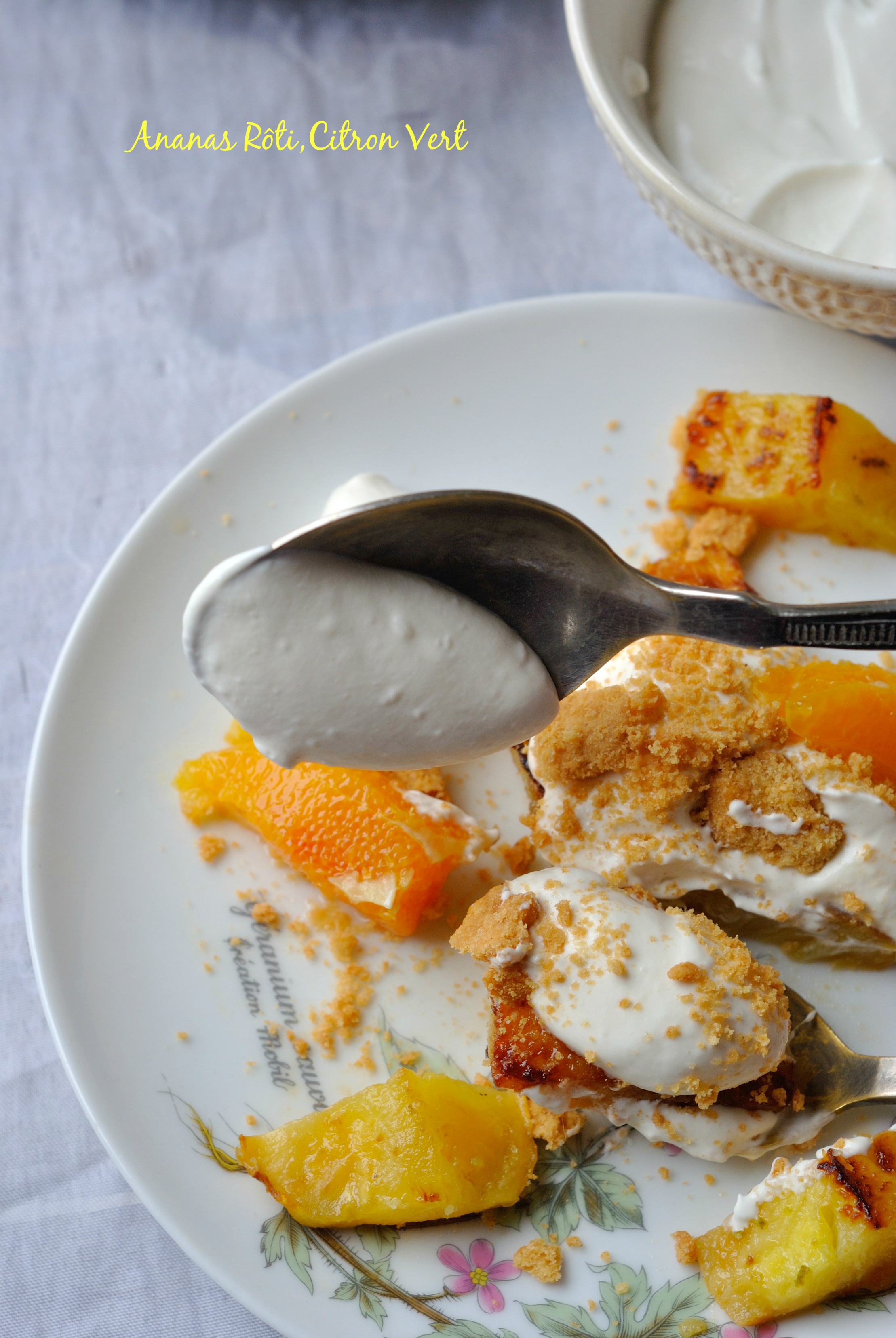 *Lors du service déposer une tranche d’ananas caramélisé,une quenelle de chantilly,et du biscuit émietté.
