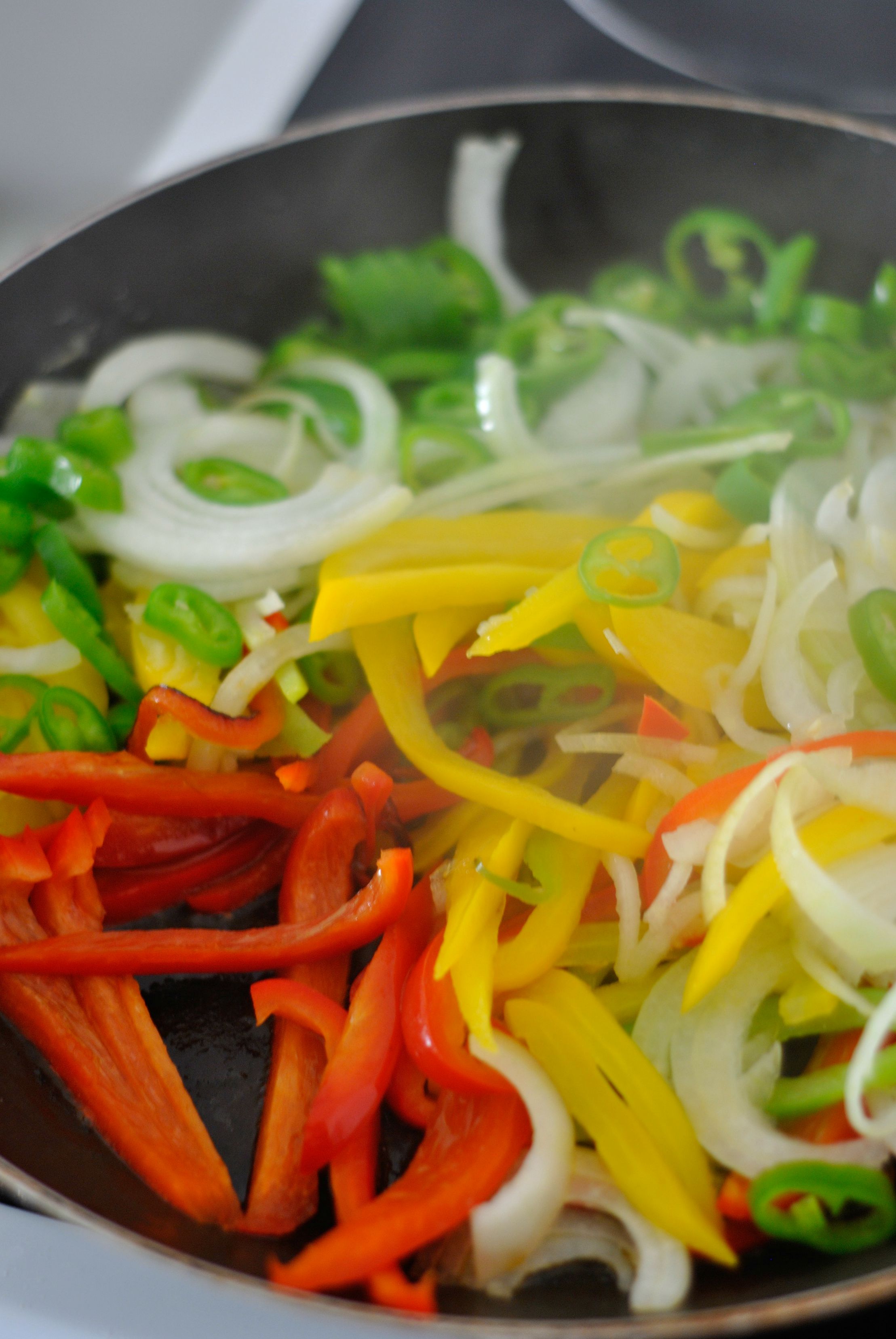 *Faire chauffer une belle lampée d’huile d’olive dans une sauteuse ou poêle.Y jeter les légumes,les laisser une minute sur feu fort sans remuer pour qu’ils prennent une belle coloration.Assaisonner de sel,de poivre,et ajouter les épices.