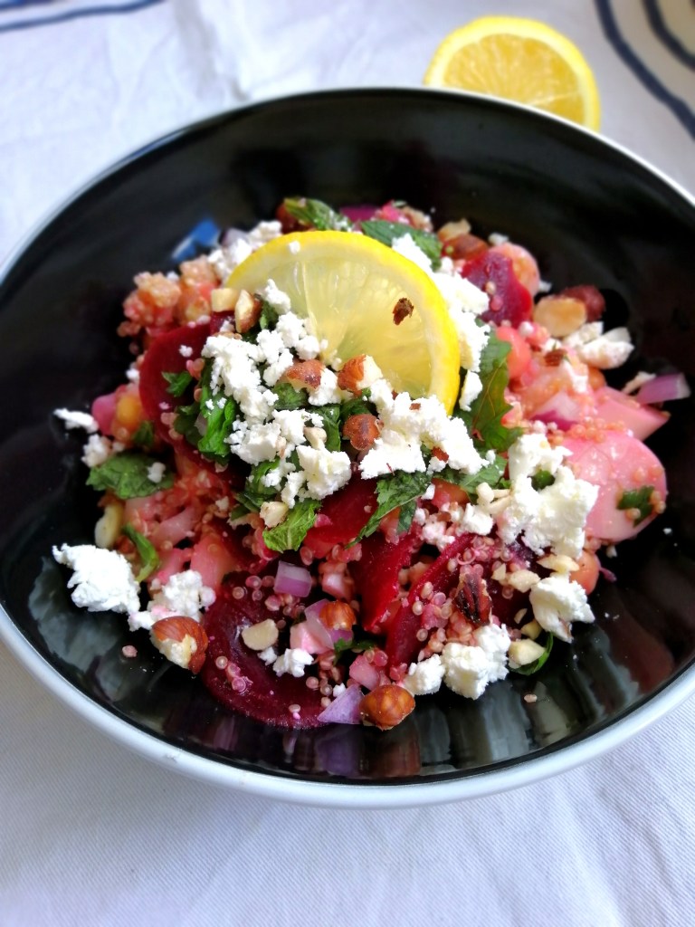 - Terminer par de la fêta émiettée des feuilles de menthe et encore un peu d’oignons rouges et de noisettes concassées ainsi qu’un filet de jus de citron.