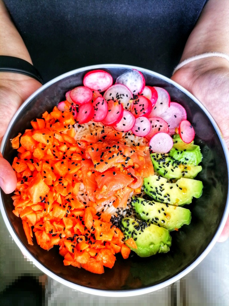Dans une assiette creuse, déposer un peu de riz assaisonné, vos légumes, le saumon et récupérer la marinade du poisson pour la mettre sur vos légumes en filet.