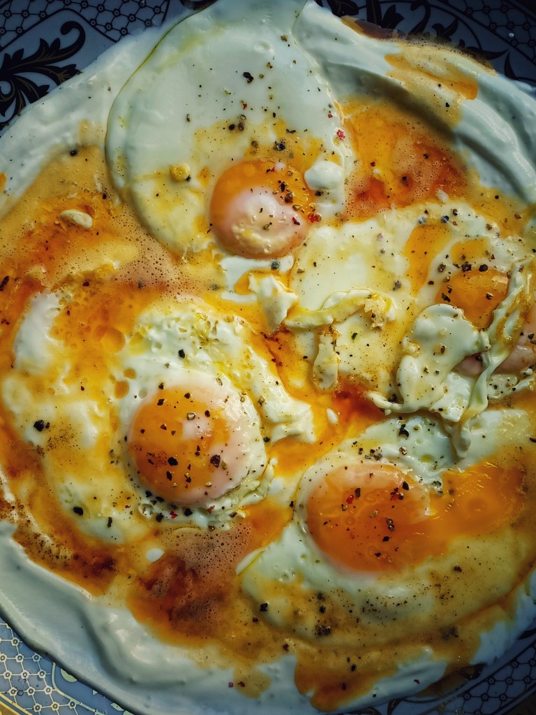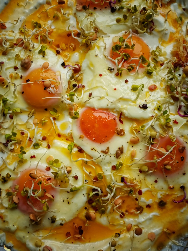 Faire cuire un ou deux œufs par personne au plat ( ici on mange l’oeuf coulant, adapte la cuisson à tes goûts). Le disposer une fois cuit sur le yaourt.