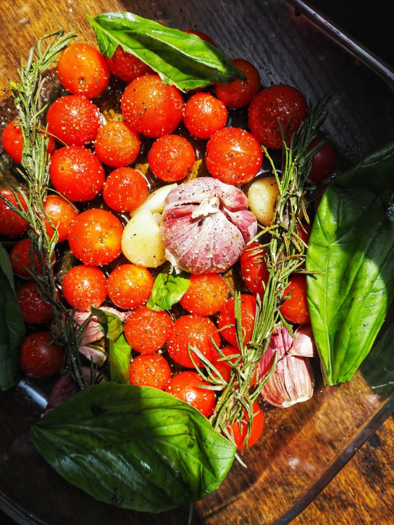 Disposer vos tomates cerises dans un plat avec du romarin, des gousses d’ail, et du basilic. Recouvrir d’huile d’olive, sel et poivre et faire cuire 30 minutes à 160°.